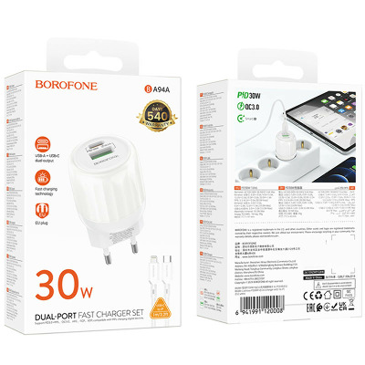 • СЗУ Borofone BA94A Lustrous PD30W+QC3.0 (1USB-A/1C)