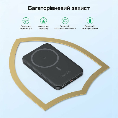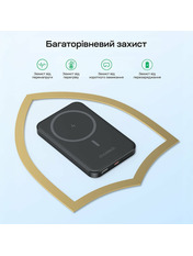 Повербанк з ємністю батареї 5000 мА·год, з бездротовою магнітною зарядкою; тип батареї: літій-полімерна (Li-pol); інтерфейси: вхід Type-C: 5V/3A, 9V/2A, 12V/1.5A (макс. 18 Вт), виходи: Type-C: 5V/3A, 9V/2.22A, 12V/1.67A (макс. 20 Вт); бездротова зарядка до 15 Вт; протокол швидкого заряджання PD; розміри 105 / 67 / 9.8 мм; вага 123.8 г; кабель Type-C to Type-C (0.5 м) у комплекті