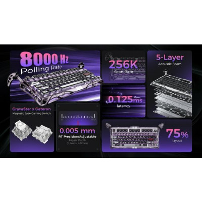 Клавіатура Gravastar Mercury V75 Pro — це високотехнологічний інструмент у стилі кіберпанк, створений для тих, хто очікує від периферії максимальної швидкості, точності та візуальної виразності. Її футуристичний дизайн з металевою рамою одразу привертає увагу, підкреслюючи міцність конструкції та преміальний характер пристрою, а багатозонне RGB-підсвічування з різноманітними ефектами органічно доповнює атмосферу сучасного геймерського сетапу. В основі Mercury V75 Pro лежить магнітна технологія Hall Effect, яка забезпечує надзвичайно точне й стабільне спрацьовування клавіш без фізичного контакту. Фірмові перемикачі GravaStar x Gateron Magnetic Jade Gaming Switch дозволяють змінювати глибину активації в діапазоні від 0,1 до 3,5 мм з точністю до 0,005 мм, завдяки чому кожен користувач може адаптувати клавіатуру під свій стиль гри або роботи. Функція Adjustable Actuation Point дає змогу індивідуально налаштовувати чутливість клавіш, перетворюючи кожне натискання на максимально контрольований рух. Надвисока частота опитування 8000 Гц із затримкою всього 0,125 мс робить реакцію клавіатури практично миттєвою, що особливо важливо у змагальних іграх. Технології Dynamic Rapid Trigger і Rapid Trigger Mode забезпечують динамічне спрацьовування без фіксованих меж та миттєве відновлення клавіш після відпускання, дозволяючи виконувати серії швидких дій без втрати контролю. Додатково функції Last Keystroke Prioritization і Snap Click гарантують, що система завжди зчитує саме останнє натискання, підвищуючи точність у напружених ігрових моментах. Для комфорту під час тривалого використання клавіатура оснащена п’ятишаровою акустичною системою з шумопоглинальної піни, яка зменшує вібрації та робить звук натискань більш м’яким і приємним. Конструкція з підтримкою hot-swappable дозволяє замінювати перемикачі без паяння, відкриваючи простір для кастомізації та експериментів. Завершує образ 16 режимів RGB-підсвічування, які дають змогу налаштувати вигляд клавіатури відповідно до настрою або стилю робочого місця. Gravastar Mercury V75 Pro стане ідеальним вибором для геймерів, які цінують швидкість і точність, для поціновувачів кіберпанк-естетики, а також для дизайнерів і творців контенту, яким важливі надійність, комфорт і технологічна досконалість у кожній деталі.