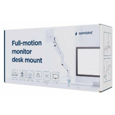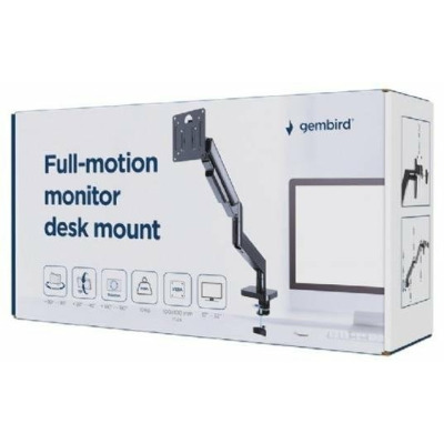 Настільний поворотний кронштейн для монітора Gembird MA-DA1-04 дозволяє ідеально позиціонувати екран для комфортної роботи. Легка конструкція з можливістю нахилу та повороту забезпечує гнучке налаштування кута огляду та можливість обертання дисплея з горизонтального в портретний режим. Завдяки ергономічному дизайну підставка зменшує напругу під час тривалого використання. Підставка сумісна з більшістю LCD-моніторів розміром до 32 дюймів та вагою від 2 до 10 кг. Міцні регульовані газові пружини надійно утримують монітор, а міцний настільний затискач забезпечує просте та надійне кріплення до столу товщиною від 10 до 50 мм. Знімна пластина VESA полегшує встановлення, а вбудована система організації кабелів допомагає підтримувати порядок на робочому місці. Підставка сумісна зі стандартами VESA 75 x 75 мм та 100 x 100 мм. Діапазон нахилу становить від +90° до -45°, повороту — від +90° до -90°, а обертання екрана — від +180° до -180°. Виготовлена з алюмінію та сталі з порошковим покриттям чорного кольору, підставка має стильний вигляд і високу міцність.