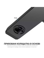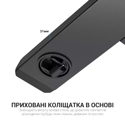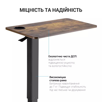OfficePro ODM366 — мобільна робоча станція для комфортної роботи та відпочинку. Завдяки плавному та тихому регулюванню висоти, столик звільняє користувачів від фіксованої робочої зони та підвищує продуктивність. Приховані коліщатка зменшують висоту основи столу, щоб ви могли підлаштувати його майже під будь-які ліжка, дивани та крісла. Газліфт преміумкласу з механізмом самоблокування забезпечує плавне та легке регулювання висоти та фіксує її. Міцна стільниця підвищує стабільність під час письма чи друкування. Вбудований тримач для напоїв запобігає падінню або вислизанню чашки або склянки під час руху.