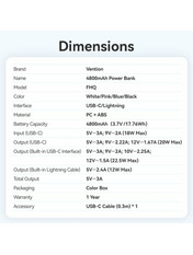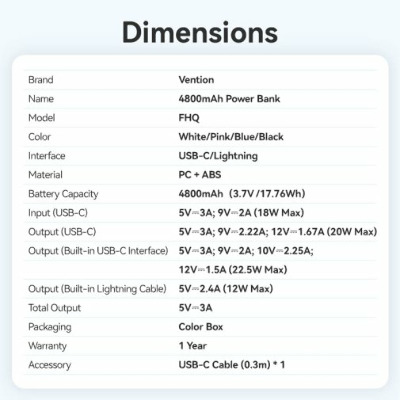 Кількість портів USB-A Відсутні Кількість портів USB-C 2 Підтримка бездротової зарядки Ні Бренд Vention Основний колір Синій Призначення Для смартфонів та планшетів Колір Blue Ємність, mAh 4800 Потужність, W 22.5 - Відгуки (0)