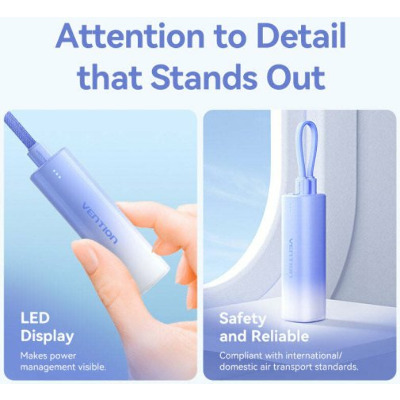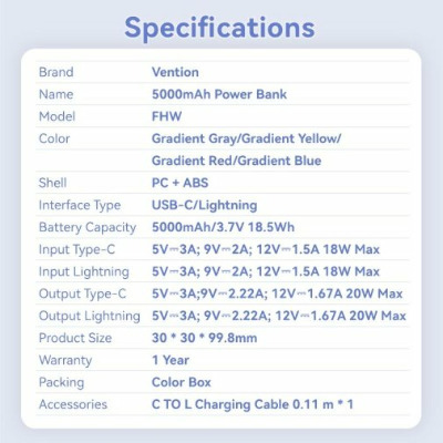 Кількість портів USB-A Відсутні Кількість портів USB-C 1 Підтримка бездротової зарядки Ні Бренд Vention Основний колір Синій Призначення Для смартфонів та планшетів Колір Gradient Blue Потужність, W 20 Ємність, mAh 5000 Артикул FHWL0 - Відгуки (0)