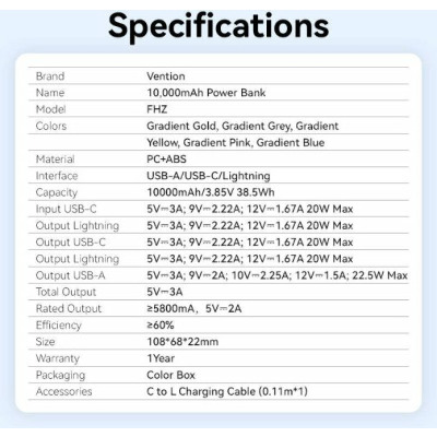 • Павербанк Vention FHZJ0 1xUSB-C + 1xUSB-A 22,5W 10000mAh Gold (FHZJ0)